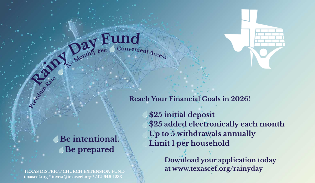 Many of us make New Year’s resolutions. In fact, a recent survey by the Certified Financial Planner Board of Standards found that 45% of respondents said that one of their resolutions was to save more money in the new year. Texas District Church Extension Fund (Texas CEF) offers the perfect opportunity to help you reach your 2026 financial goals with the Texas CEF Rainy Day Fund. This investment is designed to help you prepare for the future while supporting ministry growth across Texas.